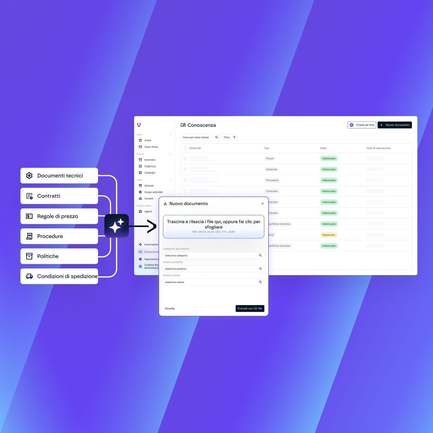Carica i tuoi cataloghi, listini prezzi, politiche di spedizione e schede prodotto. L'AI di Volta usa quel contesto per generare bozze di risposta e validare gli ordini in base ai tuoi dati reali. Il tuo team resta in controllo, con tutto ciò di cui ha bisogno a portata di mano.